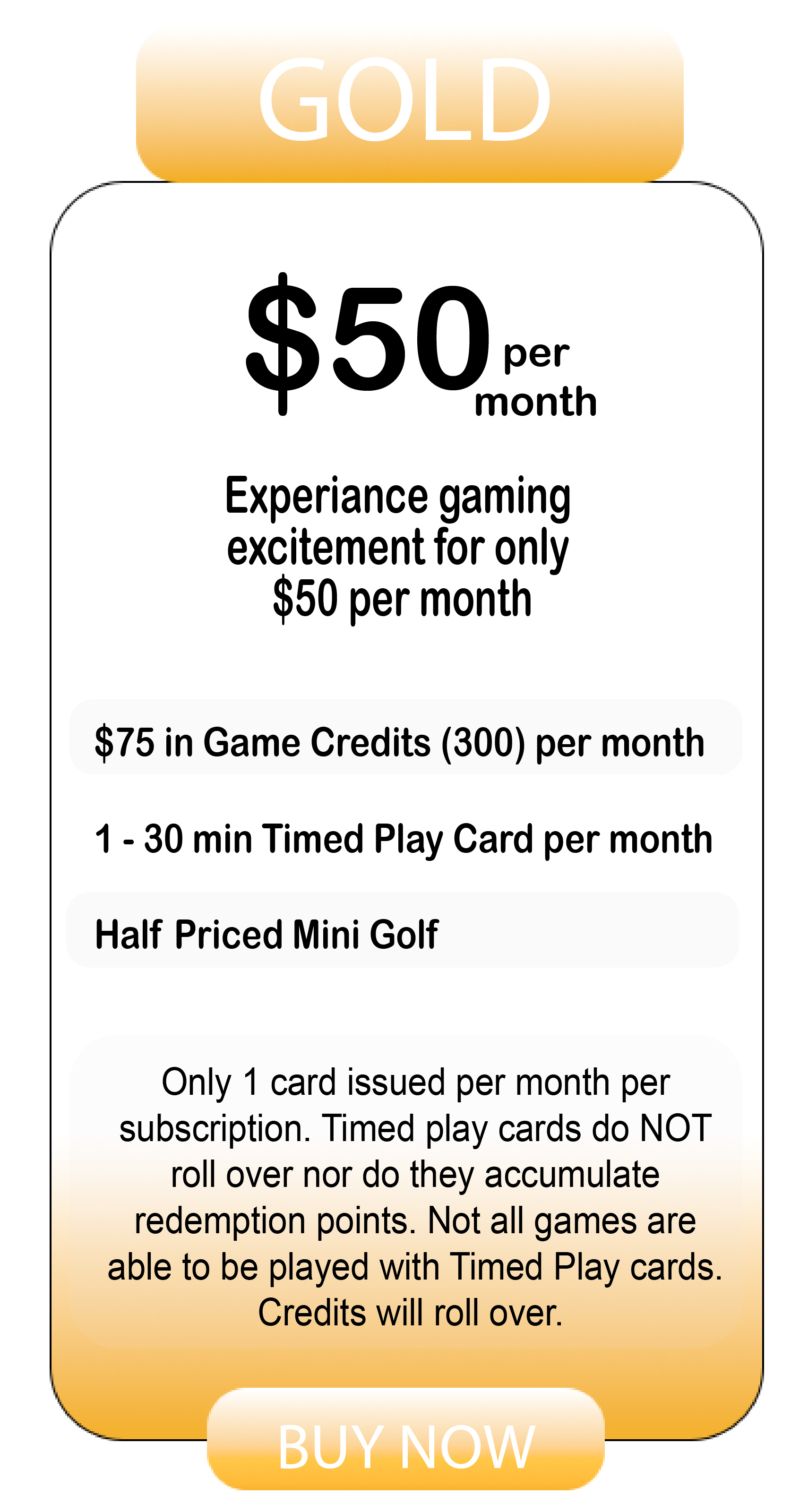 Experience gaming excitement for $50 per month. Enjoy One 30 minute free game-play session each month (non redemption), 300 arcade credits(does not expire and accumulates) half priced mini golf, and exclusive access to subscriber-only events. Subscribe now at only $50 for the first month, and $50 per month thereafter.